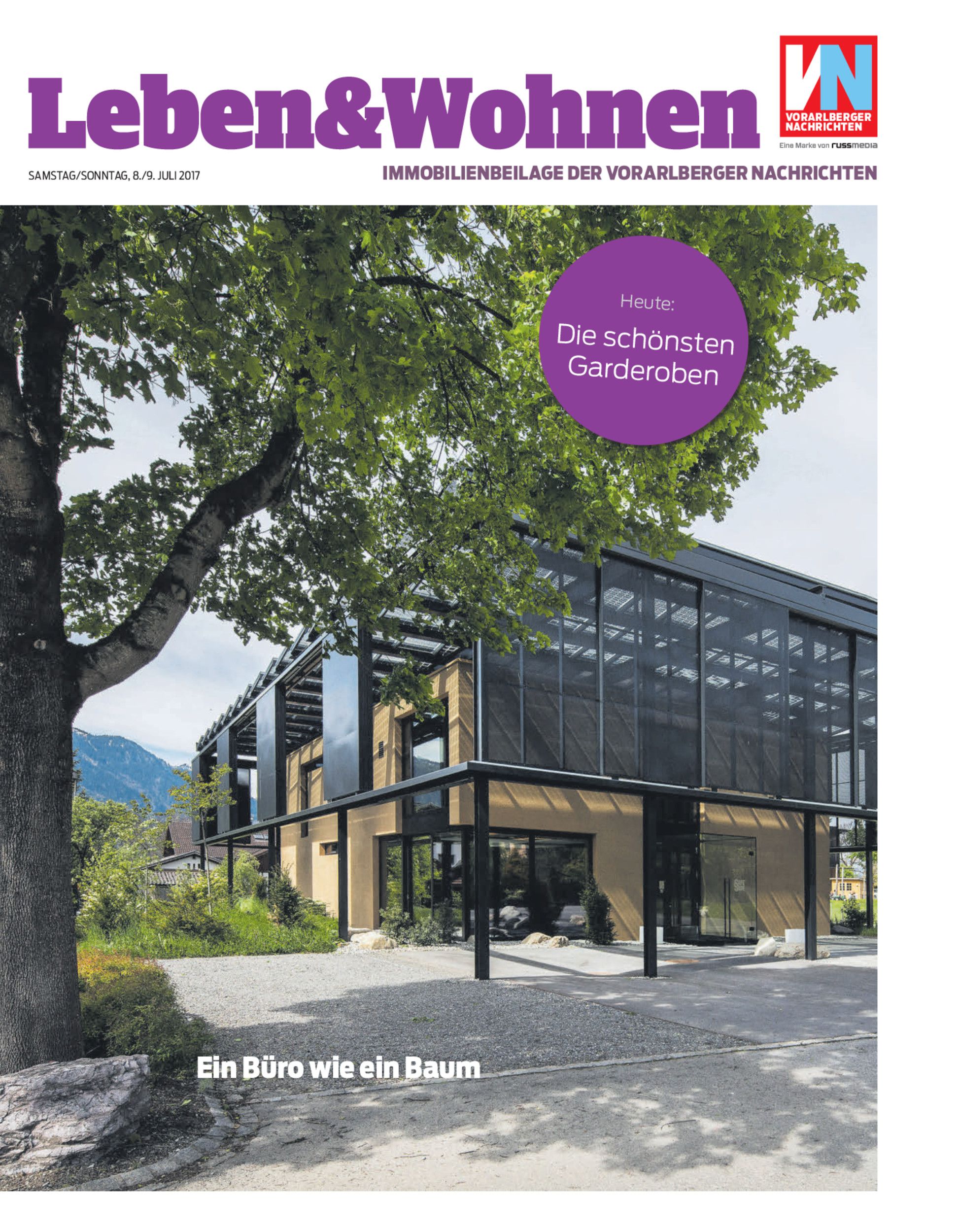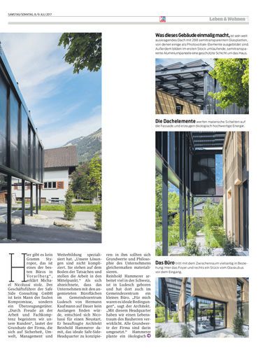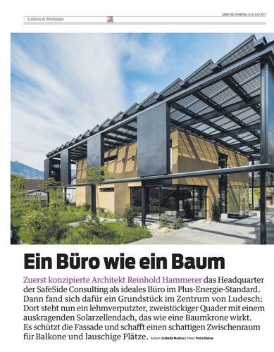 Zuerst konzipierte Architekt Reinhold Hammerer das Headquarter der SafeSide Consulting als ideales Büro im Plus-Energie-Standard. Dann fand sich dafür ein Grundstück im Zentrum von Ludesch: Dort steht nun ein lehmverputzter, zweistöckiger Quader mit einem auskragenden Solarzellendach, das wie eine Baumkrone wirkt.