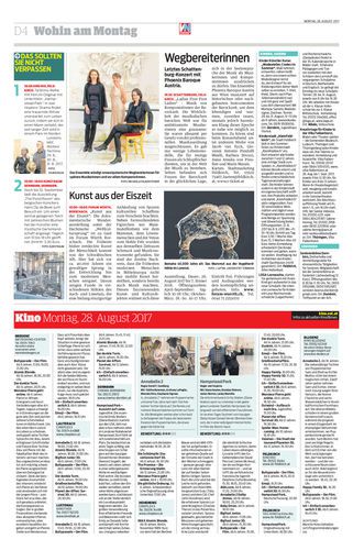 19:30 Schattenburg, Feldkirch. „Ladies First First Ladies“ – Musik von Komponistinnen der Barockzeit. Die Wirklichkeit der musikalischen barocken Welt war für ambitionierte Musikerinnen eine grausame: Sie waren allesamt per Gesetz von der professio-nellen Musikausübung ausgeschlossen. Es gab nur wenige Lebensmodelle, die für mutige Frauen als Schlupflöcher dienten, um in der Welt der Musik zu bestehen. Selten befanden sich Frauen der Barockzeit in der glücklichen Lage, sich in der Seelensprache der Musik als Musikerinnen und Komponistinnen ausdrücken zu dürfen. Das Ensemble Phoenix Baroque Austria aus Wien musiziert auf historischen oder nachgebauten Instrumenten der Barockzeit, um dem lebendigen und warmen, zuweilen rauen, niemals jedoch harmlosen Klang dieser Epoche so nahe wie möglich zu kommen. Zu hören sind beim Konzertabend unter anderem Werke von Jacob van Eyck, Giovanni Antonio Pandolfi Mealli, Barbara Strozzi, Anna Amalia von Preußen und Marin Marais.