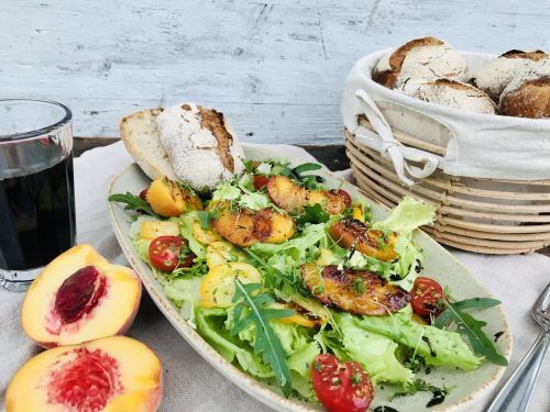 Alexandra Frick backt rustikale Brötchen. Dazu gibt es einen Sommersalat mit Pfirsichen.
