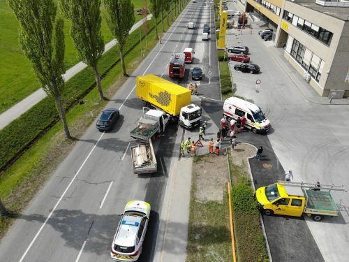 Am Freitag gegen 13 Uhr kam es auf der L41 Senderstraße in Wolfurt zu einem Unfall. Auf Höhe des Paketzentrums wollte ein Lkw auf den Parkplatz abbiegen. Aus bislang unbekannter Ursache krachte beim Manöver ein Kleintransporter, welcher auf der L41 in die Gegenrichtung unterwegs war, in den Lkw. Sho