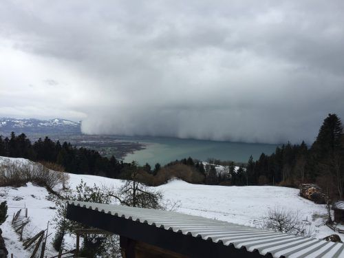 Der Himmel über dem Bodensee bot am Montag gegen Mittag eine bedrohliche Szenerie: Wie eine gewaltige Welle rollte eine Wolkenwand vom deutschen Bodenseeufer auf Vorarlberg zu. Günter Scheibenreif vom Wetterdienst der Zentralanstalt für Meteorologie und Geodynamik (ZAMG) in Bregenz hat dafür eine ei