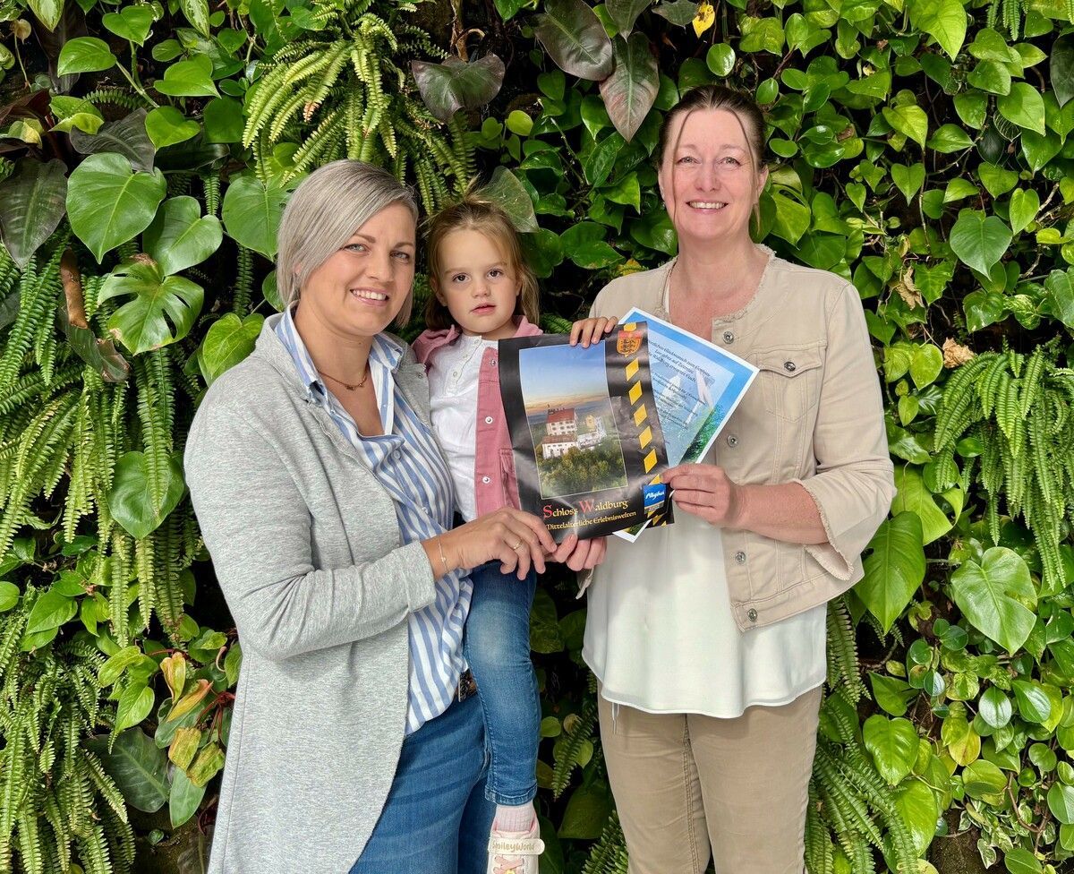 Über 1100 Teilnehmende zählte das VN-Gewinnspiel um ein „Wochenende im Mittelalter“. Als glückliche Gewinnerin wurde jetzt die Familie von Theresa Geiger (l.) aus Au ermittelt. Manuela Kresser vom VN-Regionalverkauf übergab den Gutschein fürs Familienarrangement auf Schloss Waldburg in Oberschw