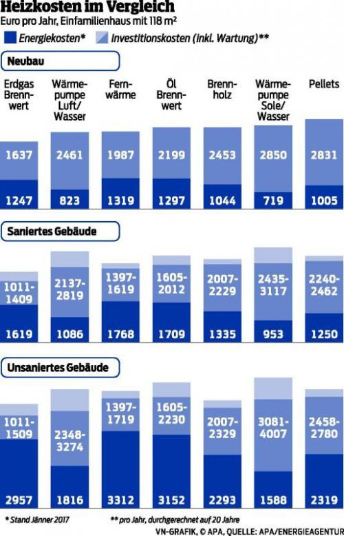 Heizen mit Erdgas bei Vollkosten-Vergleich am günstigsten. Holz und Pellets am besten für die Umwelt.