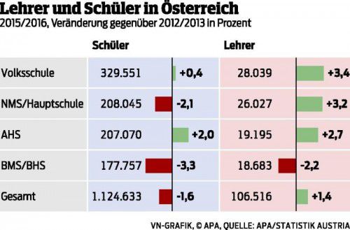 Wien. Die Zahl der Lehrer ist in den vergangenen Jahren gestiegen, während jene der Schüler zurückgegangen ist. Laut Statistik Austria gab es im Schuljahr 2012/13 insgesamt 105.000 Lehrer (Vollzeitäquivalente) für 1.142.725 Schüler, 2015/16 waren es rund 106.500 Lehrer (plus 1,5 Prozent) und 1.124.6