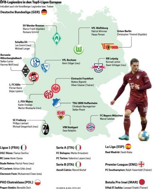 Schwarzach Österreichische Fußballkunst ist auch in der 60. Saison der deutschen Bundesliga wieder gefragt. Mit 23 Akteuren stellt Österreich nach Frankreich (35) das zweitgrößte Legionärskontingent in einer der Top-Fünf-Ligen Europas. Die Anzahl ist aber zurückgegangen. 2021/22 waren es zum Ligasta