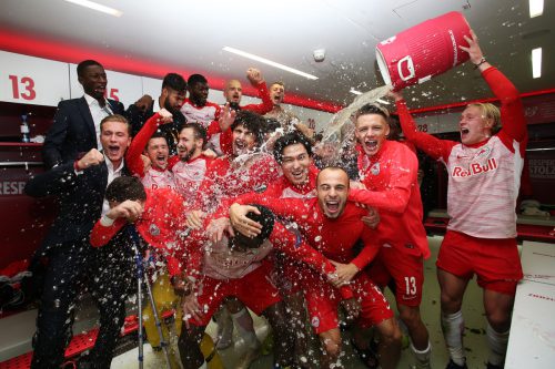 Salzburgs Himmelsstürmer stehen nach einem verdienten 1:0-Heimsieg im Bullenduell gegen Leipzig vor dem letzten Spieltag als Aufsteiger und Sieger der Gruppe B fest.