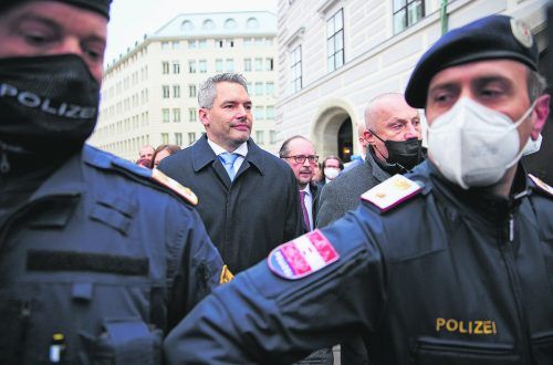 Ein Korridor aus Polizisten ebnete Bundeskanzler Karl Nehammer am Montag den Weg ins Kanzleramt. Alexander Schallenberg wechselt ins Außenministerium. Finanzminister ist Magnus Brunner. »A2, 3 RTs