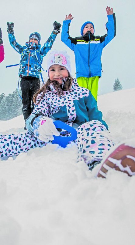 Frau Holle hat am Dienstag ganze Arbeit geleistet. Von dem Schneenachschlag ist auch dieses Trio hellauf begeistert. Die Schüler aus Diepoldsau verbringen derzeit ihre Sportwoche am Bödele. VN/Steurer