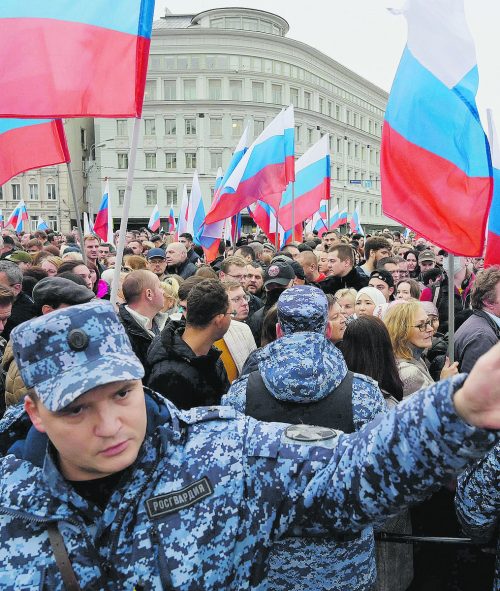 Wladimir Putin und die Anführer der besetzten ukrainischen Gebiete haben die Verträge unterzeichnet. Die Bevölkerung konnte die Rede des Kremlchefs an öffentlichen Plätzen mitverfolgen. »D11 AFP
