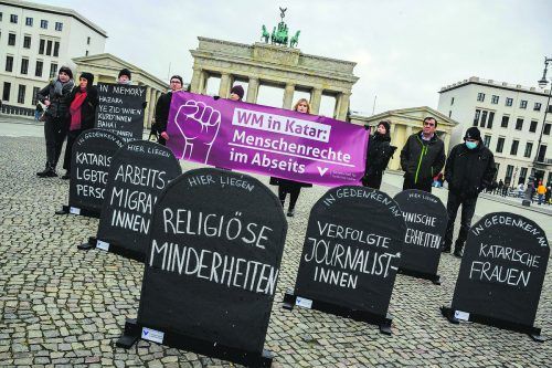 Begleitet von Protestaktionen weltweit – so wie hier in Berlin – gegen Korruption, Kommerz und fehlende Menschenrechte hat am Sonntag die 22. Fußballweltmeisterschaft in Katar begonnen. »A2, 8, C1, 2 AFP
