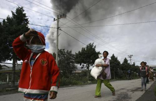Ein Vulkanausbruch auf der indonesischen Insel Sumatra hat Tausende Menschen in die Flucht getrieben, nachdem der Vulkan Sinabung rotglühende Asche und Gesteinsbrocken bis zu acht Kilometer in die Luft spuckte. Die Regierung rief die höchste Warnstufe aus. Foto: reuters