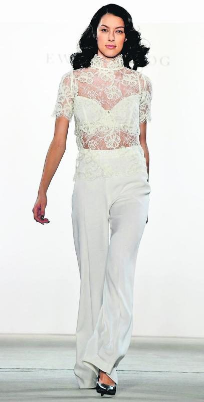 Das deutsche Model Rebecca Mir präsentierte diese edle Kreation von Ewa Hertog in Berlin. Foto: AFP