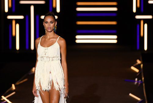 Designerin Dolores Cortes kombiniert das weiße Fransenkleid zum passenden Bikini. AFP