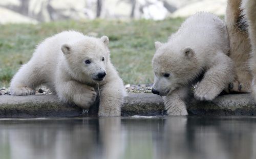 Die beiden im November im Rostocker Zoo geborenen Eisbärmädchen wurden nun auf die Namen Kaja und Skadi getauft. Nach ihrer Taufe eroberten die kleinen Eisbär-Zwillinge zusammen mit Mama Sizzel die Außenanlage und zeigten sich dabei zum ersten Mal den Zoobesuchern. dpa