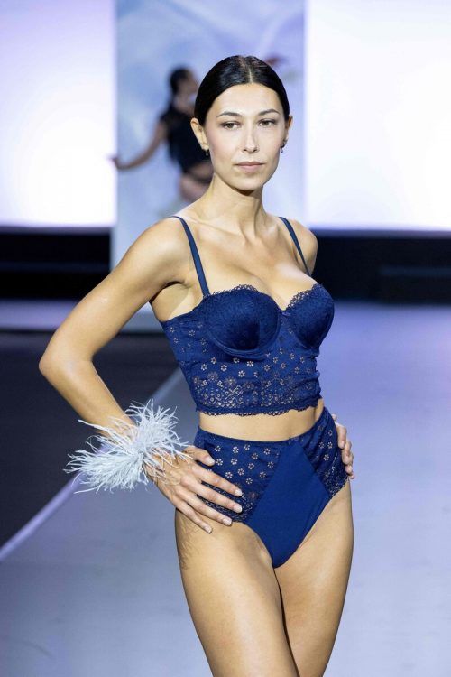 Nachtblau gepaart mit Spitze: Dieses Model ging bei der Lingerie Show in Paris über den Laufsteg. AFP