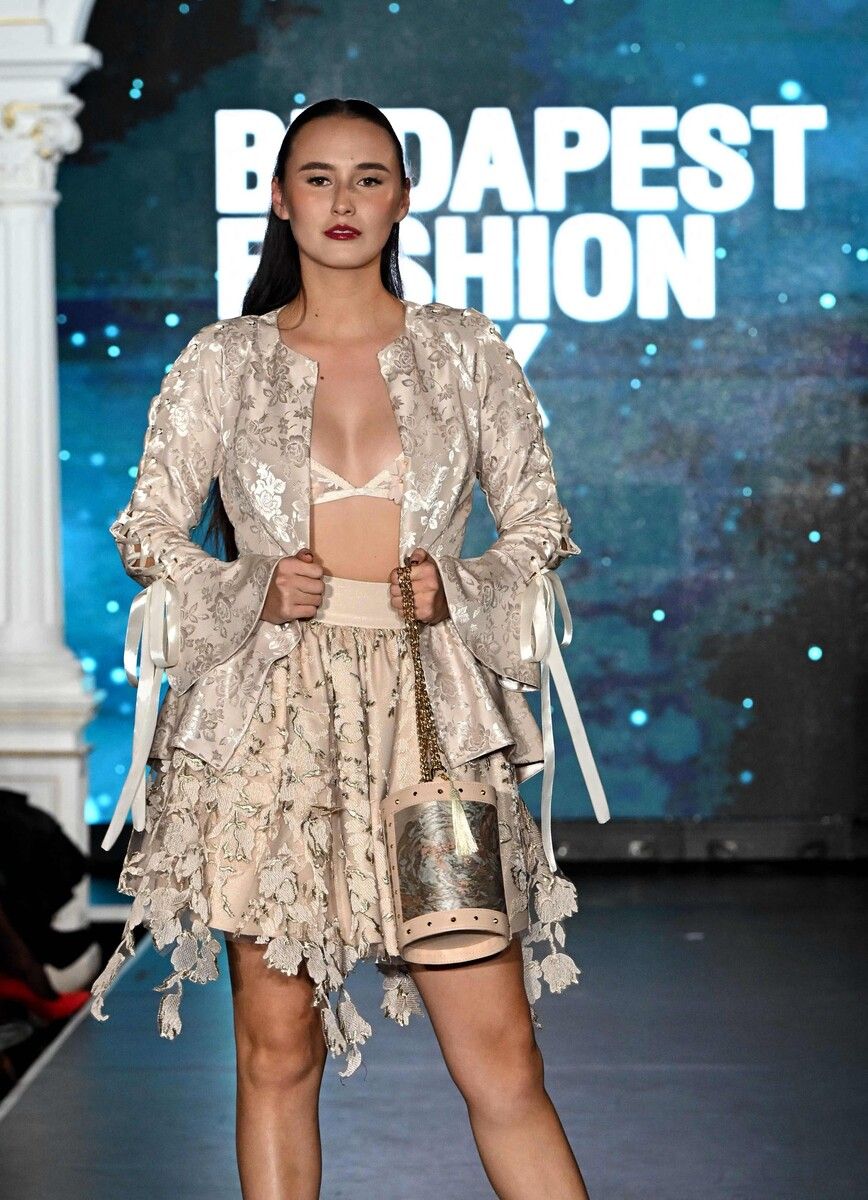 Zart bestickter Zweiteiler der ungarischen Designerin Zsuzsa Kecskemethy – gesehen bei der Budapest Fashion Week. AFp